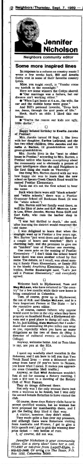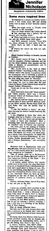 Mrs. Jacobs lives in the “next to oldest house in Pontiac,” according to Mrs. Barton, a Pontiac native who knows everything about the community and is obviously a person of great intelligence since she said Neighbors is the first thing she reads on Thursday!