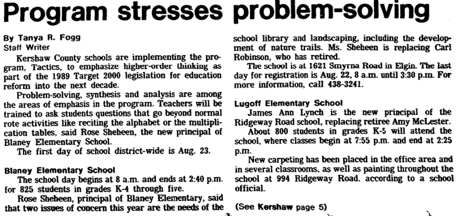 Kershaw County schools are implementing the program, Tactics, to emphasize higher-order thinking as part of the 1989 Target 2000 legislation for education reform into the next decade.