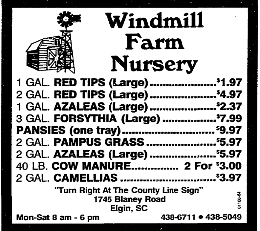 Windmill Farm Nursery 1 GAL. RED TIPS (Large) . . . . . . . .. . . . . . . . .$1.972 GAL. RED TIPS (Large). . . . . . . . . . . . . . . . .$4.973 GAL. FORSYTHIA (Large) . . . . . . . . . . . . . . . . .$7.99PANSIES (one … Continue reading Windmill Farm Nursery