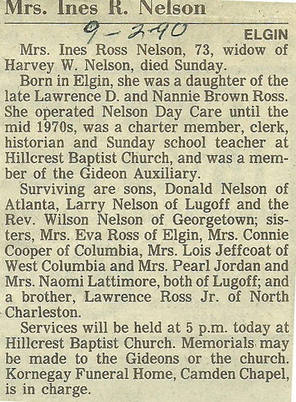 Surviving are sons, Donald Nelson of Atlanta, Larry Nelson of Lugoff and the Rev. Wilson Nelson of Georgetown; Sisters Mrs. Eva Ross of Elgin, Mrs Connie Cooper of Columbia, Mrs. Lois Jeffcoat of West Columbia and Mrs. Pearl Jordan and Mrs. Naomi Lattimore, both of Lugoff and a brother Lawrence Ross Jr. of North Charleston.