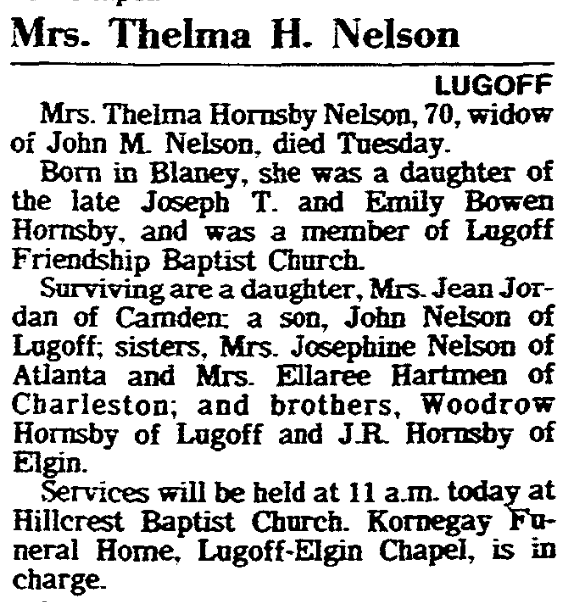 Thelma May Hornsby Nelson was born April 1, 1920 in Blaney, South Carolina, a daughter of Joseph Tillman Hornsby and Emily Bowen Hornsby.