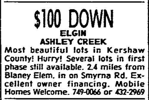 $100 DOWNELGINASHLEY CREEK Most beautiful lots in Elgin Area. Paved Roads. Mobilehome approved. 1-11 acre tracts, Smyrna Rd. 2.4 mi. from Blaney Elem. Excellent owner financing. 749-0066 or 432-2969. Continue reading Farms & Acreage