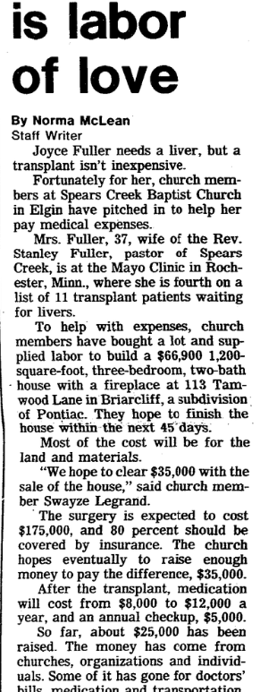 Swayze Legrand stands before a house being built by members of Spears Creek Baptist Church in Pontiac. Legrand is chairman of the church’s fund- raising committee, which is building the three-bedroom home to sell to raise money for a liver transplant for Joyce Fuller, wife of Stanley Fuller, pastor of the Spears Creek Baptist Church. Continue reading THE HOUSE THAT SPEARS CREEK BAPTISTS ARE BUILDING