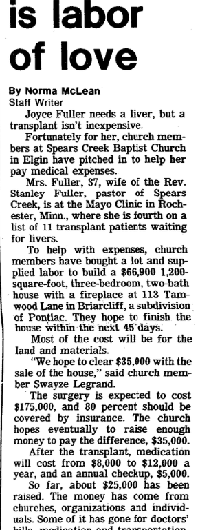 Mrs. Fuller, 37, wife of the Rev. Stanley Fuller, pastor of Spears Creek, is at the Mayo Clinic In Rochester, Minn., where she is fourth on a list of 11 transplant patients waiting for livers.