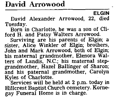 Surviving were his parents of Elgin; a sister, Alice Winkler of Elgin; brother, John Arrowood and Mark Arrowood, both of Elgin, his maternal grandmother, Elenora Walters of Landis, N.C.; his maternal step-grandmother, Hazel Ballinger of Sharon; and his paternal grandmother, Carolyn Kyles of Charlotte.