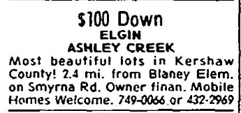 Most beautiful lots in Kershaw County! 2.4 mi. from Blaney Elem. on Smyrna Rd. Owner finan. Mobile Homes Welcomed. 749-006 or 432-2969.