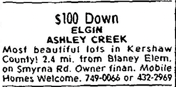 Most beautiful lots in Kershaw County! 2.4 mi. from Blaney Elem. on Smyrna Rd. Owner finan. Mobile Homes Welcomed. 749-006 or 432-2969.