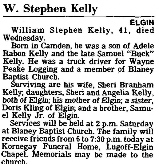 Surviving are his wife, Sheri Branham Kelly; daughters, Sheri Kelly and Angelia Kelly, both of Elgin; his mother of Elgin; a sister, Doris Kling of Elgin; and a brother, Samuel Kelly Jr. of Elgin.