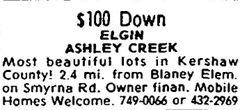 Most beautiful lots in Kershaw County! 2.4 mi. from Blaney Elem. on Smyrna Rd. Owner finan. Mobile Homes Welcomed. 749-006 or 432-2969.