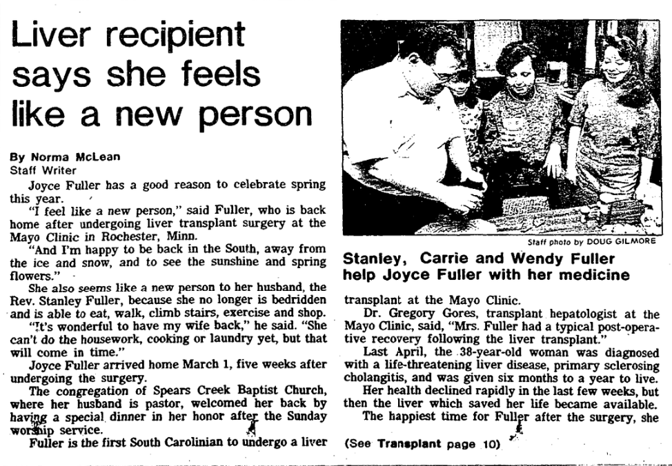 Fuller is the first South Carolinian to undergo a liver transplant at the Mayo Clinic.