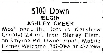 Most beautiful lots in Kershaw County! 2.4 mi. from Blaney Elem. on Smyrna Rd. Owner finan. Mobile Homes Welcomed. 749-006 or 432-2969.