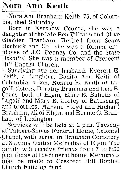 Surviving are her husband, Everett E Keith; a daughter, Bonita Ann Keith of Columbia; a son, Ronald E. Keith of Lugoff; sisters, Dorothy Branham and Lois B. Carns, both of Elgin, Effie B. Baliotis of Lugoff and Mary B. Corley of Batesburg; and brothers, Marvin Branham, Floyd Branham and Richard Branham, all of Elgin, and Bennie O. Branham of Lexington.