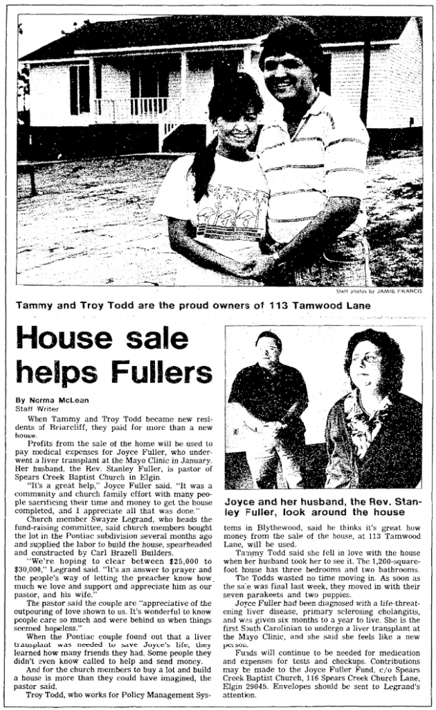 Profits from the sale of the home will be used to pay medical expenses for Joyce Fuller, who underwent a liver transplant at the Mayo Clinic in January. Her husband, the Rev. Stanley Fuller, is pastor of Spears Creek Baptist Church in Elgin.