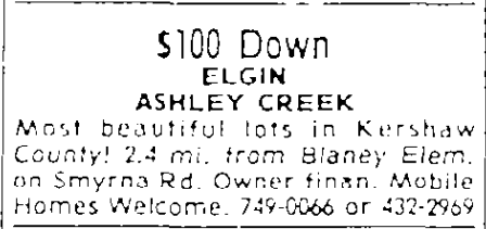Most beautiful lots in Kershaw County! 2.4 mi. from Blaney Elem. on Smyrna Rd. Owner Finan. Mobile Homes Welcome. 749-0066 or 432-2969.