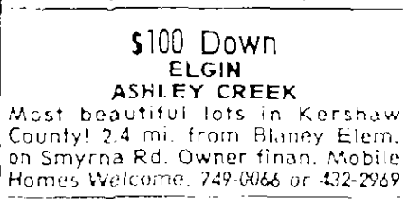 Most beautiful lots in Kershaw County! 2.4 mi. from Blaney Elem. on Smyrna Rd. Owner Finan. Mobile Homes Welcome. 749-0066 or 432-2969.