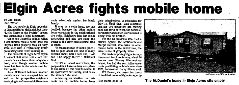 Lisa McDaniel believes another mobile home once occupied her lot and that her prospective neighbors are trying to enforce restrictive covenants selectively against her black family.