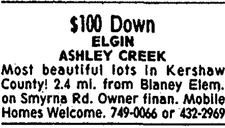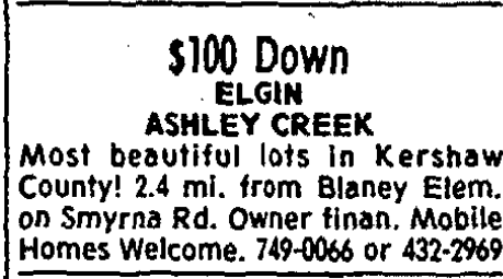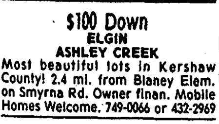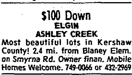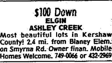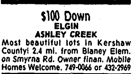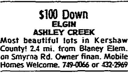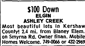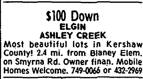 ELGINASHLEY CREEK Most beautiful lots in Kershaw County! 2.4 mi. from Blaney Elem. on Smyrna Rd. Owner Finan. Mobile Homes Welcome. 749-0066 or 432-2969. Continue reading $100 Down