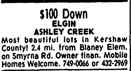 Most beautiful lots in Elgin Area. Paved Roads. Mobilehome approved. 1-11 acre tracts, Smyrna Rd. 2.4 mi. from Blaney Elem. Excellent owner financing. 749-0066 or 432-2969.