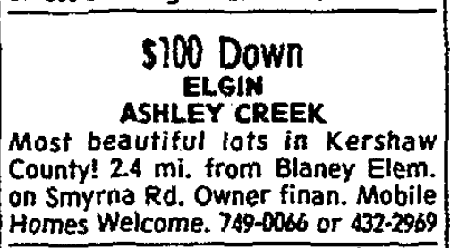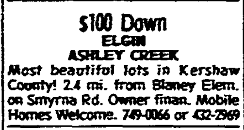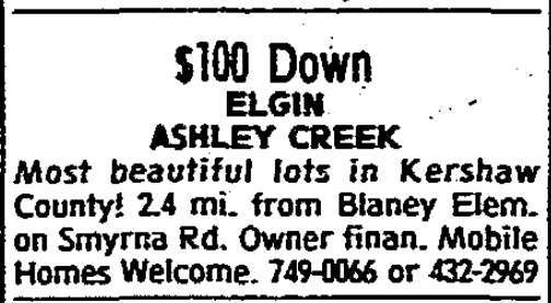 $100 DOWNELGINASHLEY CREEK Most beautiful lots in Elgin Area. Paved Roads. Mobilehome approved. 1-11 acre tracts, Smyrna Rd. 2.4 mi. from Blaney Elem. Excellent owner financing. 749-0066 or 432-2969. Continue reading Farms & Acreage