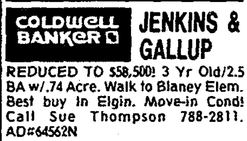 Coldwell Banker Jenkins & Gallup REDUCED TO $58,500! 3 Yr Old/ 2.5 BA w/ .74 Acre. Walk to Blaney Elem. Best Buy in Elgin. Move-in Cond. Call Sue 788-28110. AD #64562N Continue reading Homes For Sale