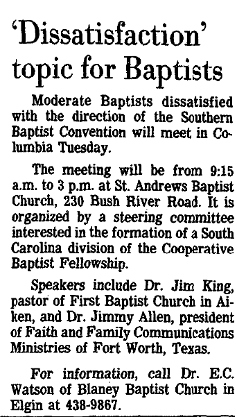 Moderate Baptist dissatisfied with the direction of the Southern Baptist Convention will meet in Columbia Tuesday. The meeting will be from 9:15 a.m. to 3 p.m. at St. Andrews Baptist Chruch, 230 Bush River Road. It is organized by a steering committee interested in the formation of a South Carolina division of the Cooperative Baptist Fellowship. Speakers include Dr. Jim King, pastor of First Baptist … Continue reading ‘Dissatisfaction’ topic for Baptist