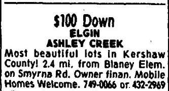 Most beautiful Lots in Kershaw County! 2.4 mi. from Blaney Elem. on Smyrna Rd. Owner finan. Mobile Homes Welcomed. 749-006 or 432-2969.