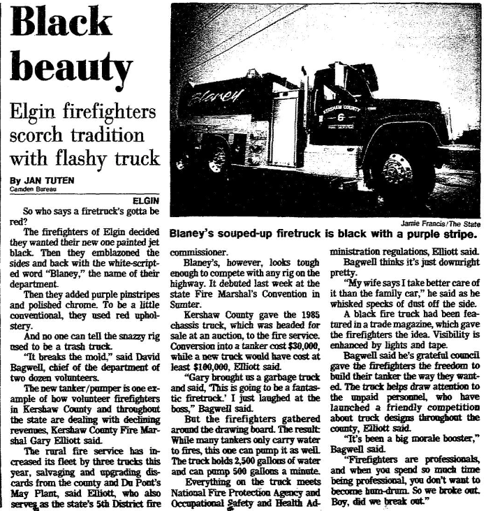 The firefighters of Elgin decided they wanted their new one pained jet black. Then they emblazoned the sides with the white-scripted word “Blaney,” the name of their department.