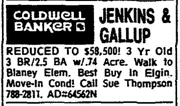 REDUCED TO $58,500! 3 Yr Old 3 BR/2.5 BA w/.74 Acre. Walk to Blaney Elem. Best Buy in Elgin. Move-In Cond! Call Sue Thompson 788-2811. AD #64562N