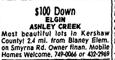 Most beautiful Lots in Kershaw County! 2.4 mi. from Blaney Elem. on Smyrna Rd. Owner finan. Mobile Homes Welcomed. 749-006 or 432-2969.
