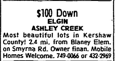 Most beautiful Lots in Kershaw County! 2.4 mi. from Blaney Elem. on Smyrna Rd. Owner finan. Mobile Homes Welcomed. 749-006 or 432-2969.