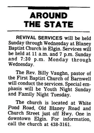 REVIVAL SERVICES will be held Sunday through Wednesday at Blaney Baptist Church in Elgin. Services will be held at 11 a.m. and 7 p.m. Sunday and 7:30 p.m. Monday through Wednesday.