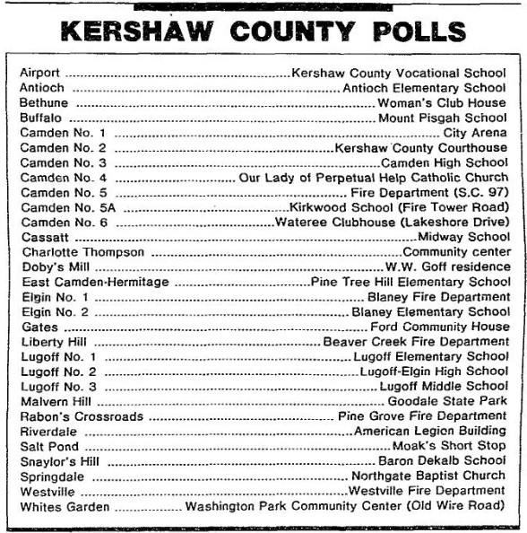 | Camden No. 6 | . . . . . . . . . | Wateree Clubhouse (Lake Shore Drive) |