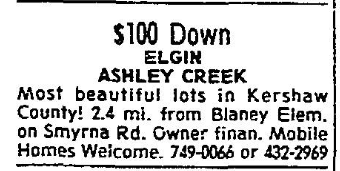 Most beautiful Lots in Kershaw County! 2.4 mi. from Blaney Elem. on Smyrna Rd. Owner finan. Mobile Homes Welcomed. 749-006 or 432-2969.