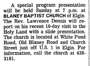 A special program presentation will be held Sunday at 7 p.m. at BLANEY BAPTIST CHURCH of Elgin. The Rev. Lawrence Dennis will report on his recent 10-day visit to the Holy Land with a slide presentation. The church is located at White Pond Road, Old Blaney Road and Church Street just off U. S. 1 in Elgin. For information, call the church at 438-3161.