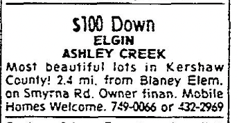 Most beautiful Lots in Kershaw County! 2.4 mi. from Blaney Elem. on Smyrna Rd. Owner finan. Mobile Homes Welcomed. 749-006 or 432-2969.