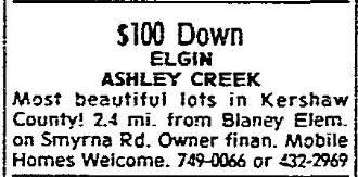 $100 Down ELGIN ASHLEY CREEK Most beautiful Lots in Kershaw County! 2.4 mi. from Blaney Elem. on Smyrna Rd. Owner finan. Mobile Homes Welcomed. 749-006 or 432-2969. Continue reading Farms & Acreage