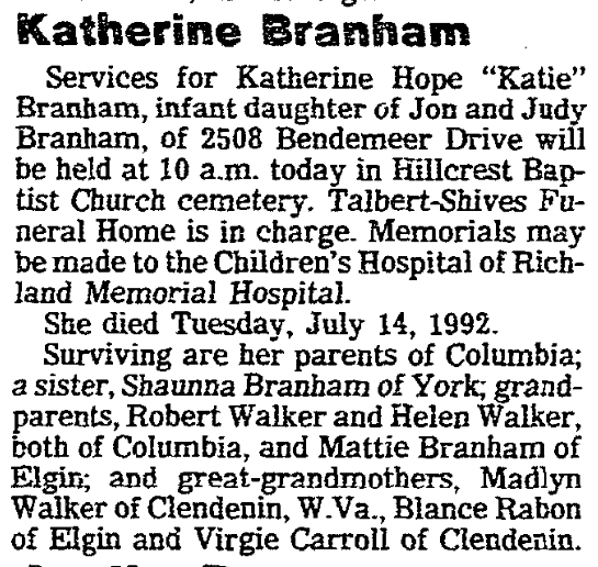 Surviving were her parents of Columbia; a sister, Shaunna Branham of York; grandparents, Robert Walker and Helen Walker, both of Columbia, and Mattie Branham of Elgin; and great-grandmothers, Madlyn Walker of Clendenin, W. Va., Blance Rabon of Elgin and Virgie Carrol of Clendenin.