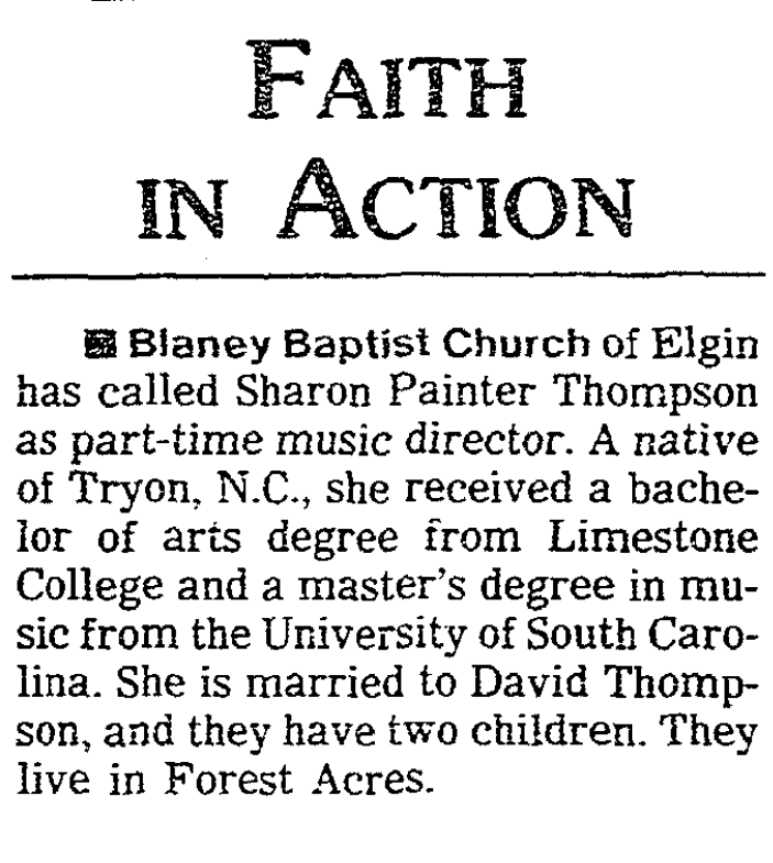 Blaney Baptist Church of Elgin has called Sharon Painter Thompson as part-time music director. A native of Tryon, N. C., she received a bachelor of arts degree from Limestone College and a master’s degree in music from the University of South Carolina. She is married to David Thompson, and they have two children. They live in Forest Acres.