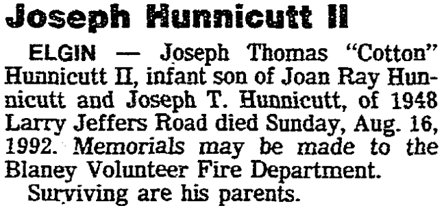 ELGIN – Joseph Thomas “Cotton” Hunnicutt II, infant son of Joan Ray Hunnicutt and Joseph T. Hunnicutt, of 1948 Larry Jeffers Road died Sunday, August 16, 1992. Memorials may be made to the Blaney Volunteer Fire Department.