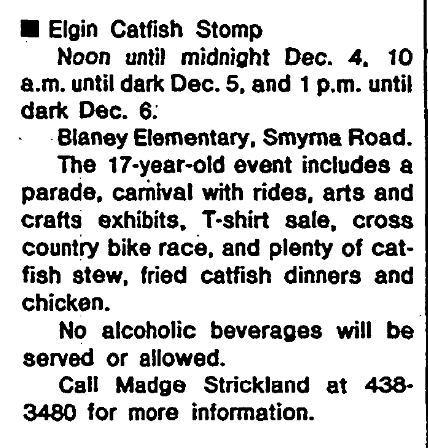 The 17-year-old event includes a parade, carnival with rides, arts and crafts exhibits, T-shirt sale, cross county bike race, and plenty of catfish stew, fried catfish dinner and chicken.