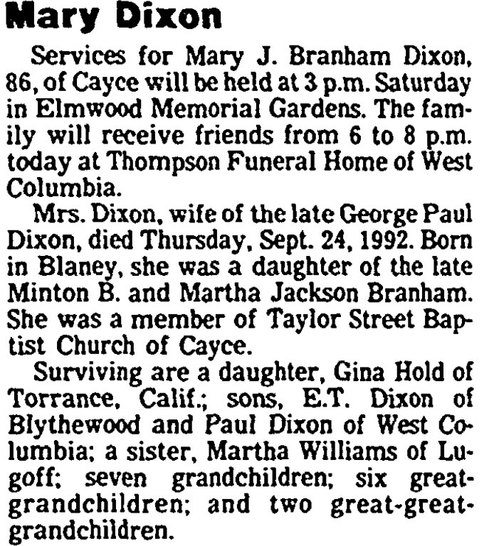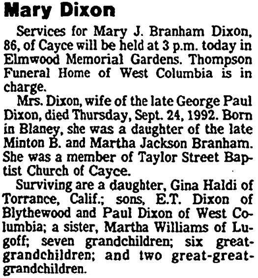 Mrs. Dixon, wife of the late George Paul Dixon, died Thursday, September 24, 1992. Born in Blaney, she was a daughter of the late Minton B. Branham and Martha Jackson Branham. She was a member of Taylor Street Baptist Church of Cayce.