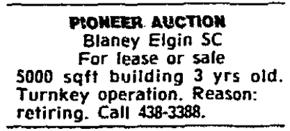 5000 sqft building 3 years old. Turnkey operation. Reason: retiring. Call 438-3388.
