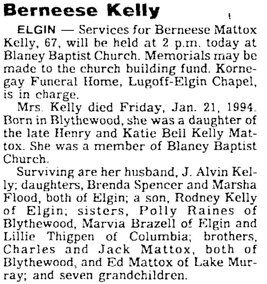 Mrs. Kelly died Friday, Jan. 21, 1994. Born in Blythewood, she was a daughter of late Henry Mattox and Katie Bell Kelly. She was a member of Blaney Baptist Church.