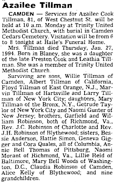 Surviving are sons, Willie Tillman of Camden, Albert Tillman of California, Floyd Tillman of East Orange, N. J., Marvin Tillman of Hartsville and Larry Tillman of New York City; daughters, Mary Tillman of the Bronx, N. Y., Getrude Taylor of New York City and Naomi Gunter of New Jersey; brothers, Garfield Robinson and William Robinson, both of Richmond, Va., Rev. J. C. Robinson of Charlotte and Rev. J. H. Robinson of Blythewood; sisters, Bessie Anderson, Hattie Simon, Geneva Giger and Cora Quales, all of Columbia, Annie Bell Thomas of Pittsburg, Naomi Morant of Richmond, Va., Lillie Reid of Baltimore, Mary Bell Woods of Washington, D. C., Claudia Robinson of Camden, Alice Kelly of Blythewood; and nine grandchildren.