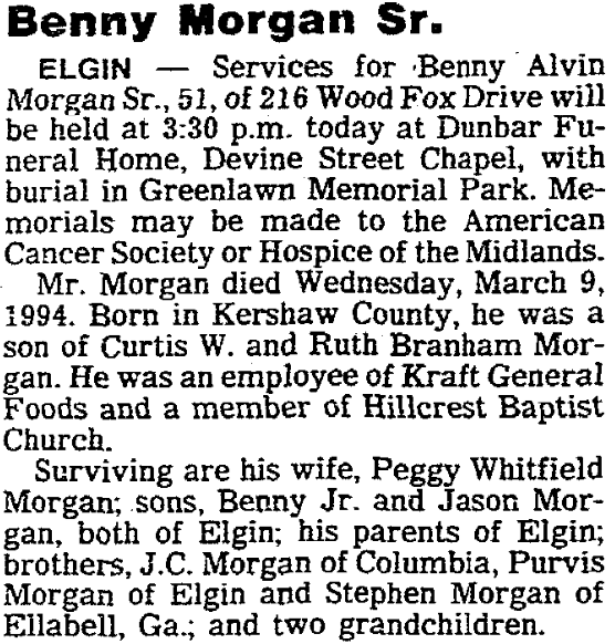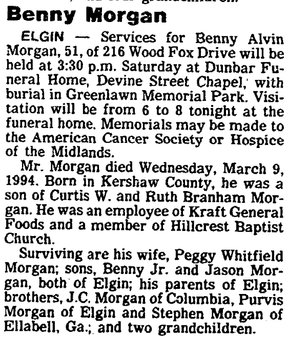 Surviving are his wife, Peggy Whitfield Morgan; sons, Benny Morgan, Jr. and Jason Morgan, both of Elgin; his parents of Elgin; brothers, J. C. Morgan of Columbia, Purvis Morgan of Elgin and Stephen Morgan of Ellabell, Ga.; and two grandchildren.