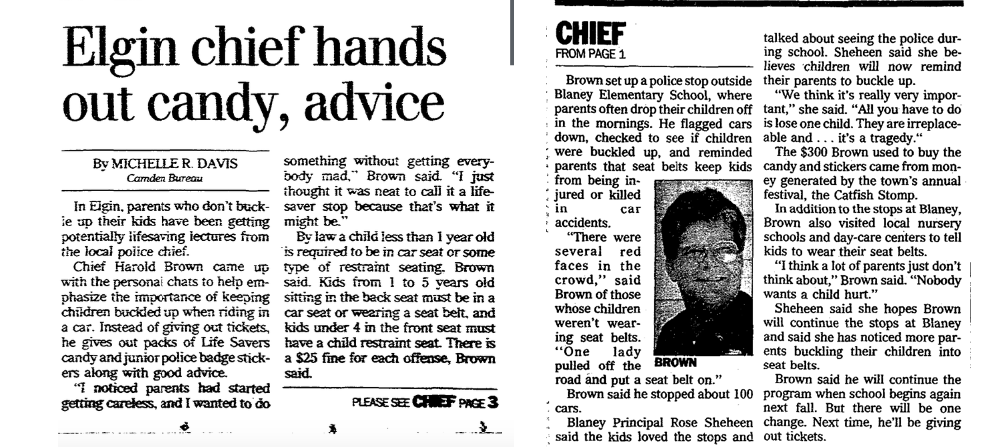 Chief Harold Brown Came up with the personal chats to help emphasize the importance of keeping children buckled up when riding in a car. Instead of giving out tickets, he gives out packs of Life savers candy and junior police badge stickers along with good advice.