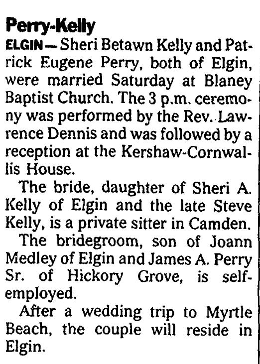 ELGIN – Sherri Betawn Kelly and Patrick Eugene Perry, both of Elgin, were married Saturday at Blaney Baptist Church. The 3 p.m. ceremony was performed by the Rev. Lawrence Dennis and was followed by a reception at the Kershaw-Cornwallis House.