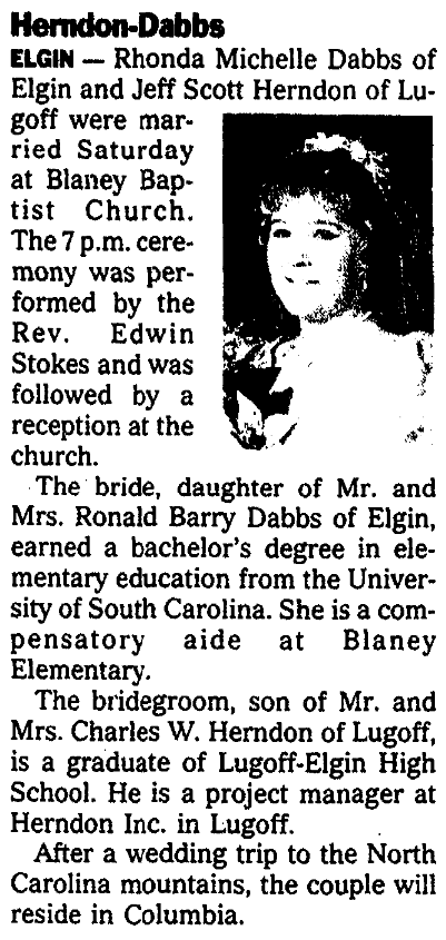 ELGIN – Rhonda Michelle Dabbs of Elgin and Jeff Scott Herndon of Lugoff were married Saturday at Blaney Baptist Church. The 7 p.m. ceremony was performed by the Rev. Edwin Stokes and was followed by a reception at the church.