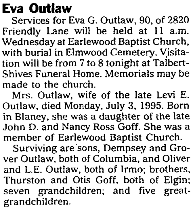 On March 11, 1992, Eva Outlaw was mentioned as the living sister in the obituary of James Boykin Goff.