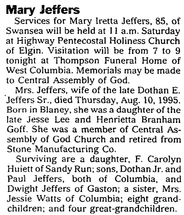 Surviving are a daughter, F. Carolyn Huiett of Sandy Run; sons, Dothan Jeffers, Jr., and Paul Jeffers, both of Columbia, and Dwight Jeffers of Gaston; a sister, Mrs. Jessie Watts of Columbia; eight grandchildren; and four great-grandchildren.